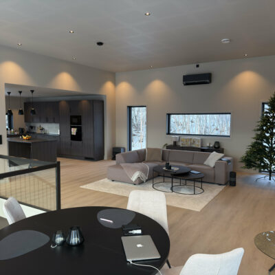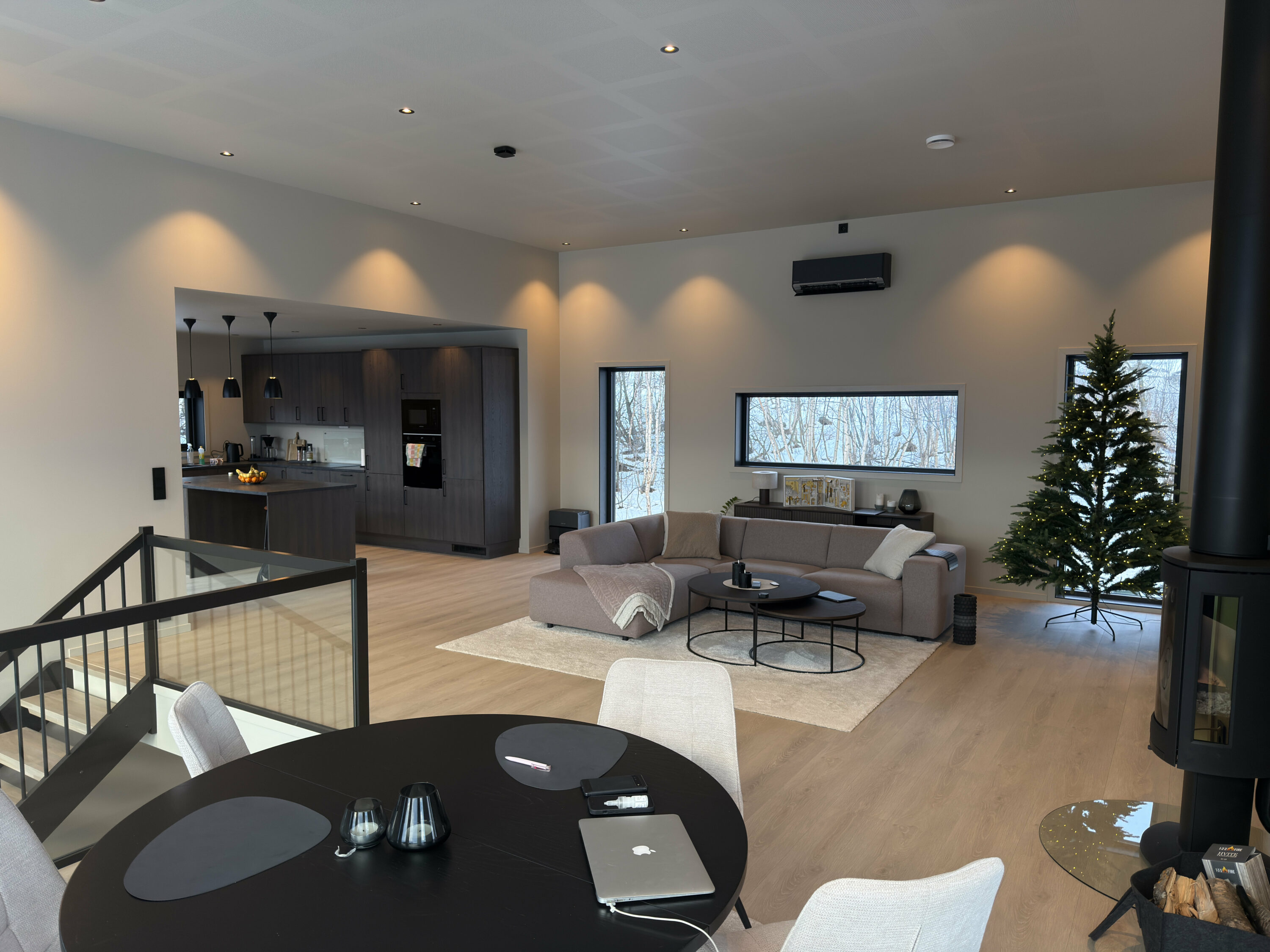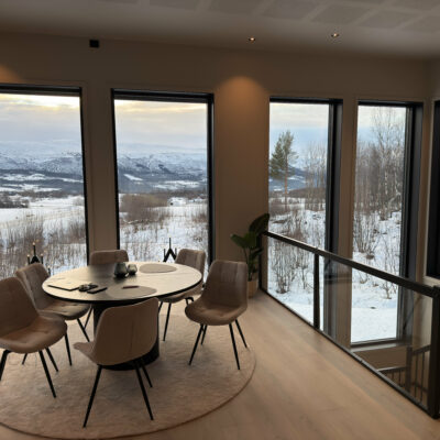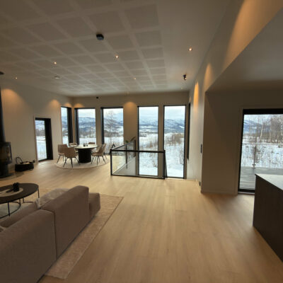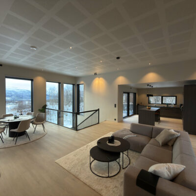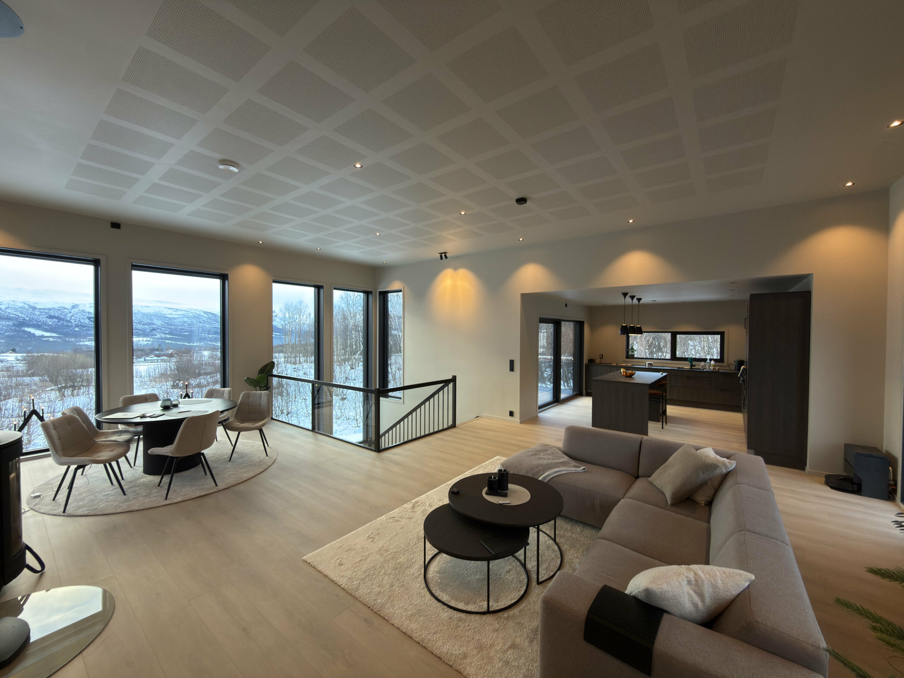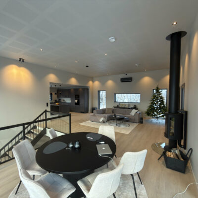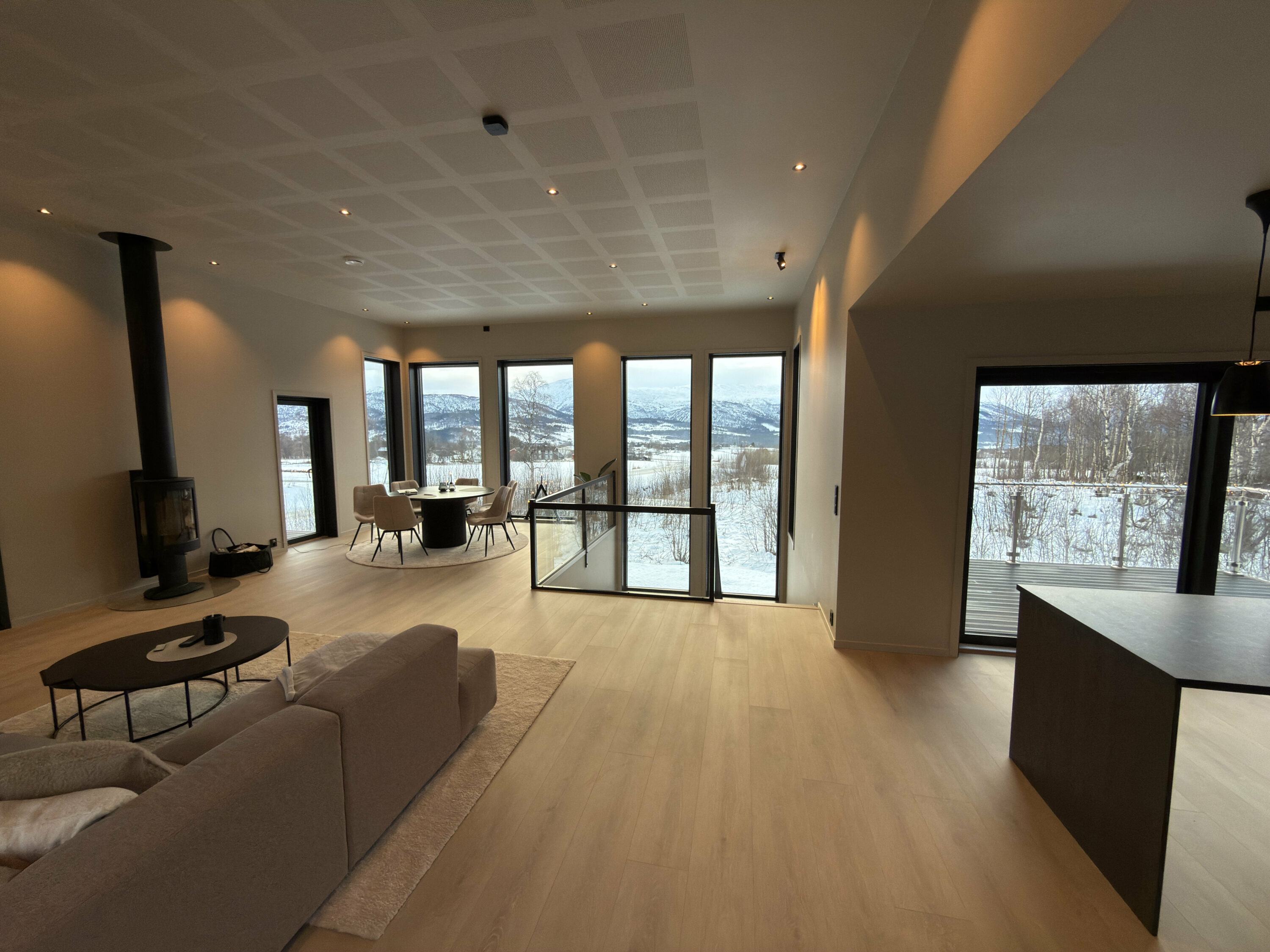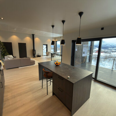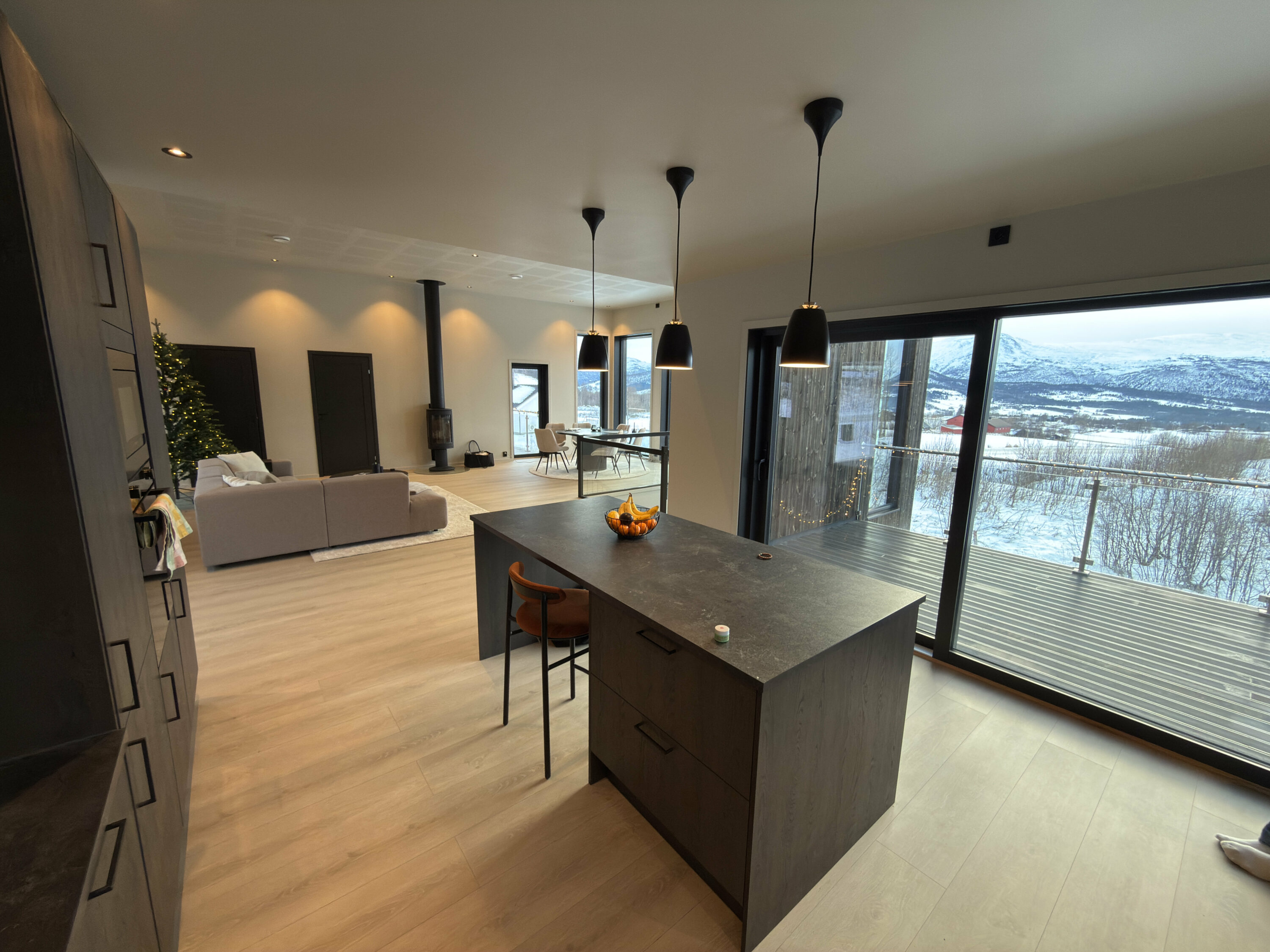 Åpen og romslig stue- og kjøkkenløsning gir en unik romfølelse som det er lett å trives i. Spisestuen er sentralt plassert nettopp med tanke på å kunne nyte utsikten mens du sitter til bords.